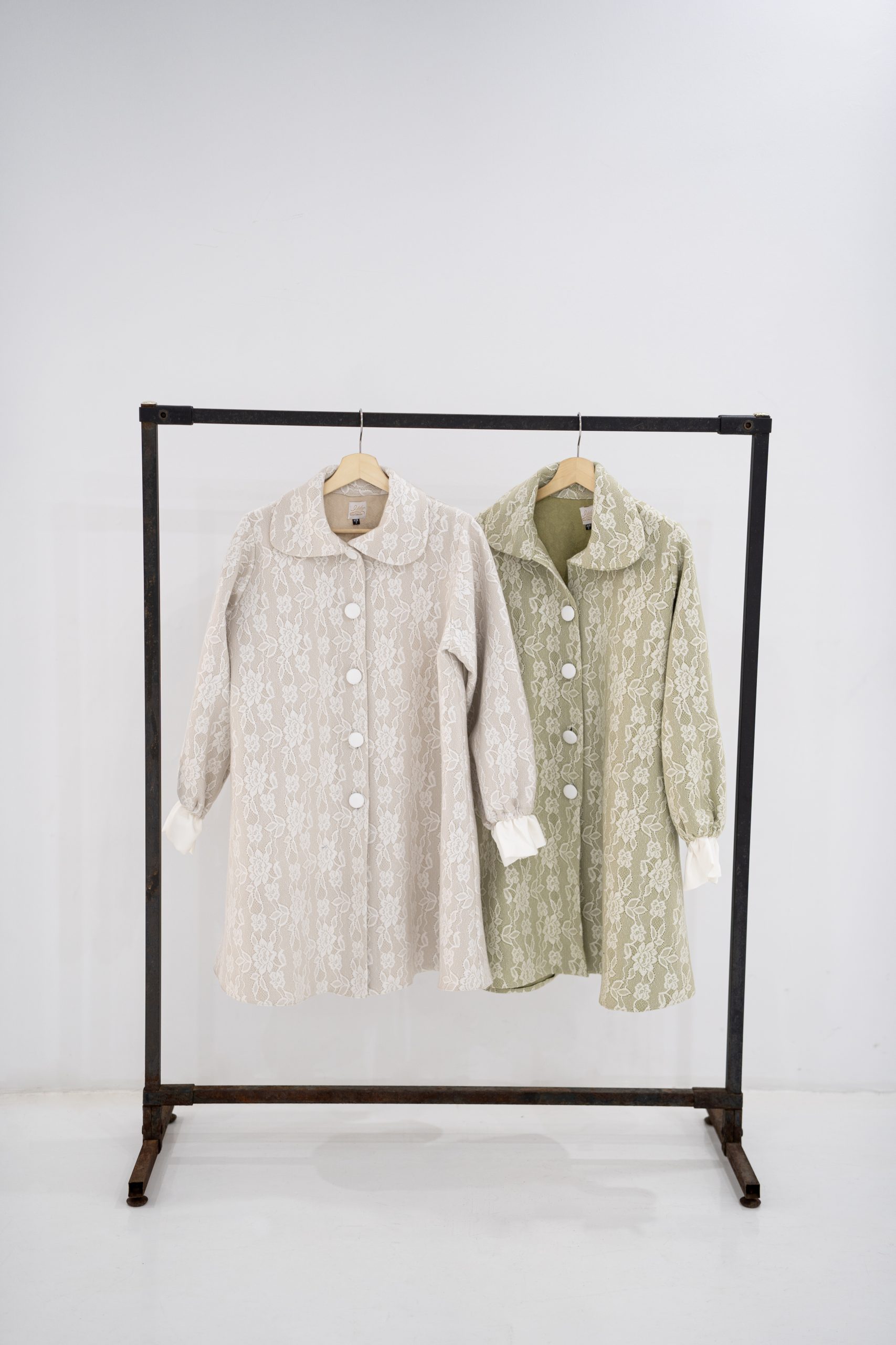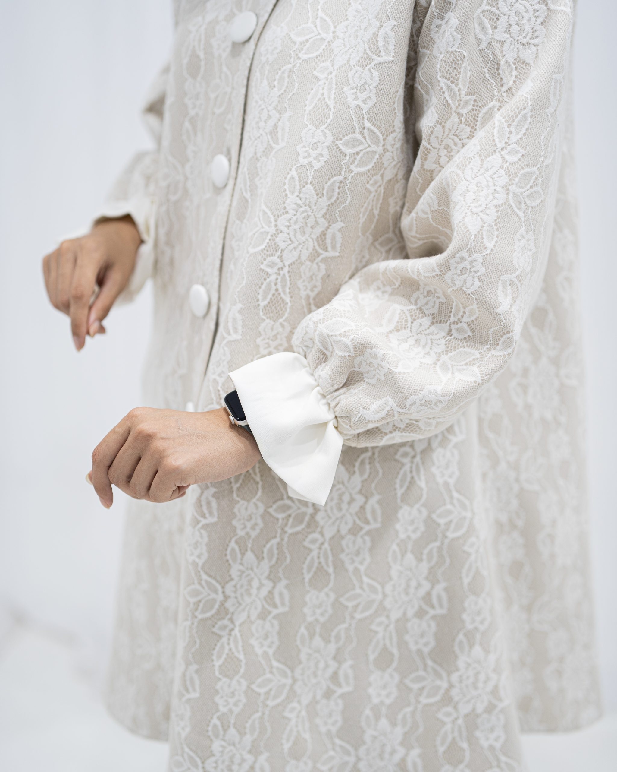پالتو فوتر تور دوزی شده ،لبه استین و دکمه های پارچه کرپ سفید کار شده و کل تنه توردوزی شده هست